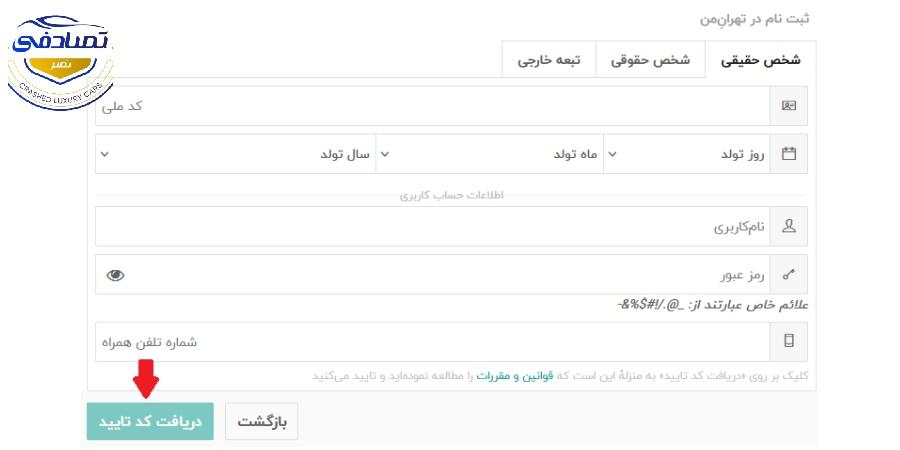 - سپس یک کد 6 رقمی، به شماره همراه متقاضی به صورت پیامک ارسال می شود. کد را در قسمت مربوطه وارد کنید و دکمه سبز رنگ ثبت نام در تهران من را انتخاب کنید