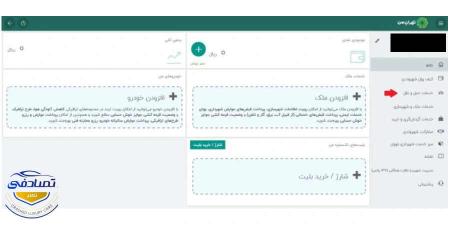 - در صورت عدم نمایش ماشین، باید روی + کلیک کنید و اطلاعات خودرو خود را وارد کنید تا در سامانه تهران من ثبت شود.
