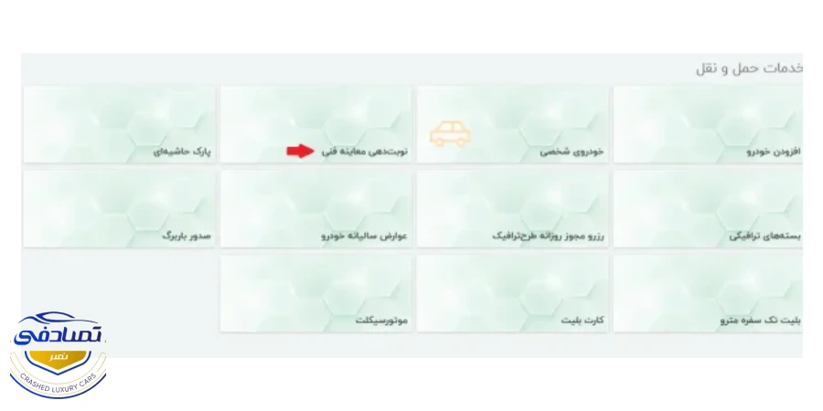 - از بین سرویس های متعدد، گزینه خدمات حمل و نقل را انتخاب کنید. سپس نوبت دهی معاینه فنی را انتخاب کنید.